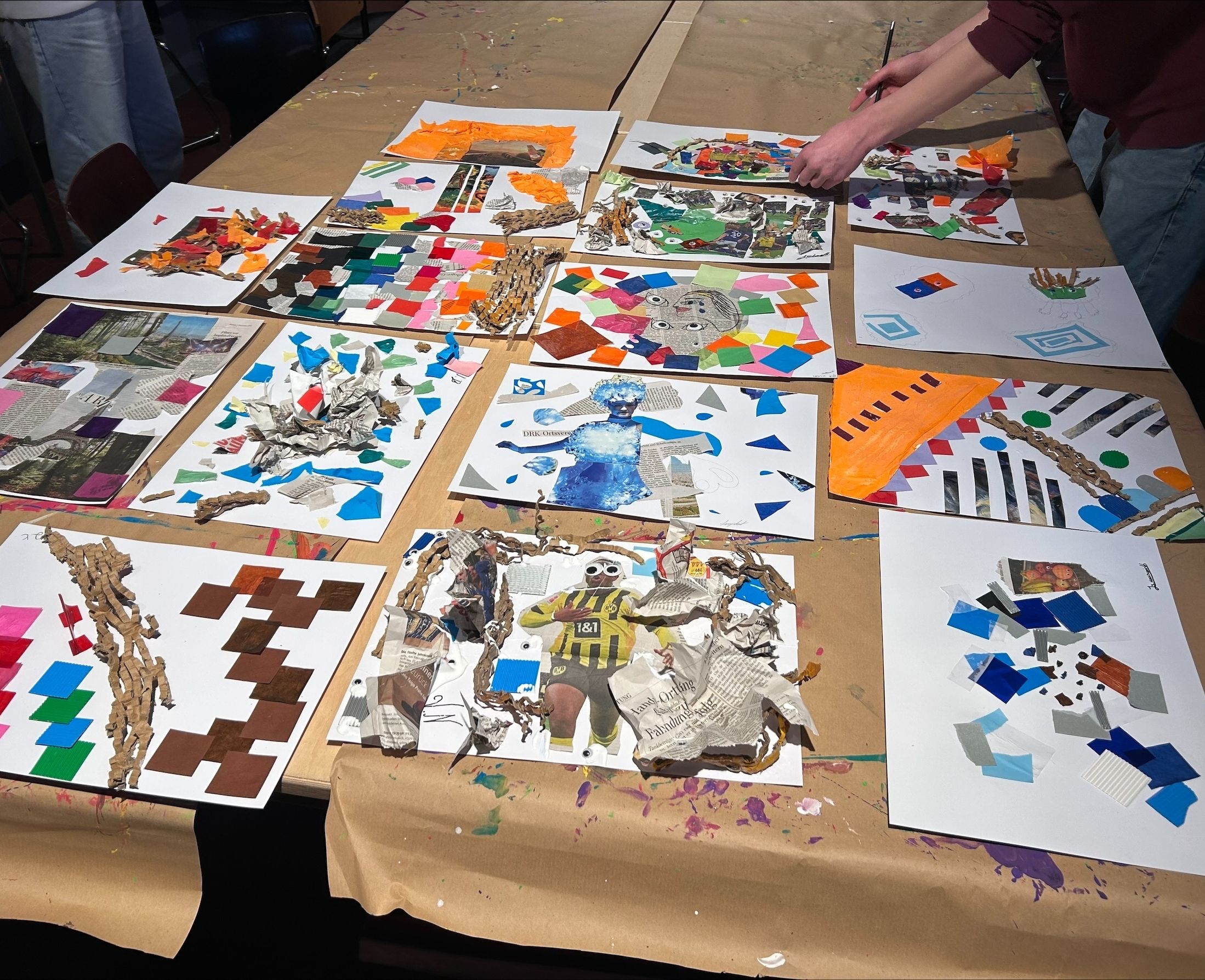 Im Anschluss an die Führung folgte ein praktischer Workshop zum Thema Collage. Dabei konnten die Schülerinnen und Schüler selbst kreativ werden. Mit unterschiedlichen Materialien wie Zeitschriftenausschnitten, Papier und Farben gestalteten sie eigene Collagen. Der Workshop bot die Möglichkeit, die zuvor gesehenen künstlerischen Ideen praktisch auszuprobieren und eigene Bildkompositionen zu entwickeln.